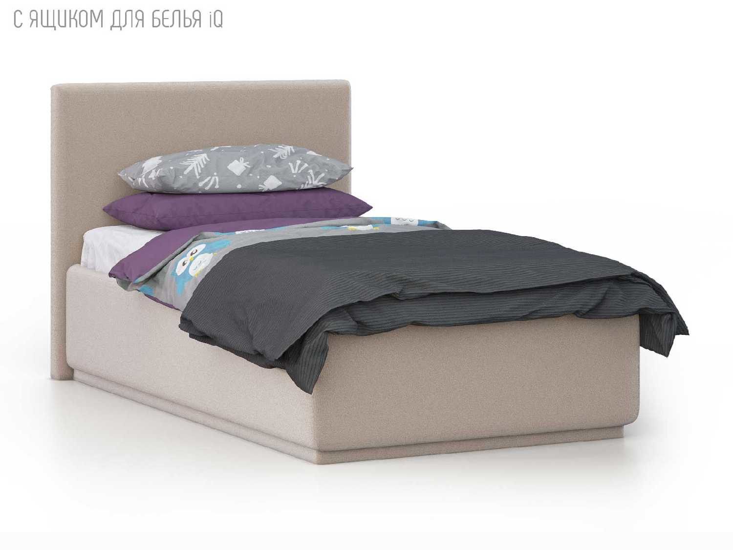 Кровать укомплектована IQ с подъемным механизмом и ящиком для белья без дна (дополнительная платная опция - дно к ящику IQ из HDF (ХДФ). Каркас кровати на цоколе, декоративный чехол на цоколе съёмный. Глубина ящика для белья - 30 см, без ограничения нагрузки на ящик.