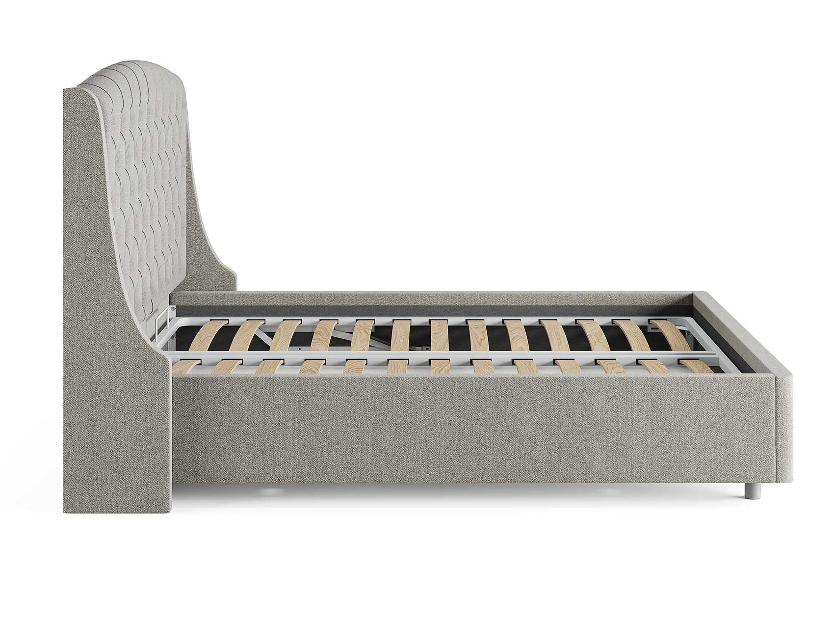 Кровать комплектуется металлическим основанием и подъемным механизмом со вместительным бельевым ящиком. Дно бельевого ящика легко сдвигается для обеспечения уборки под кроватью.
