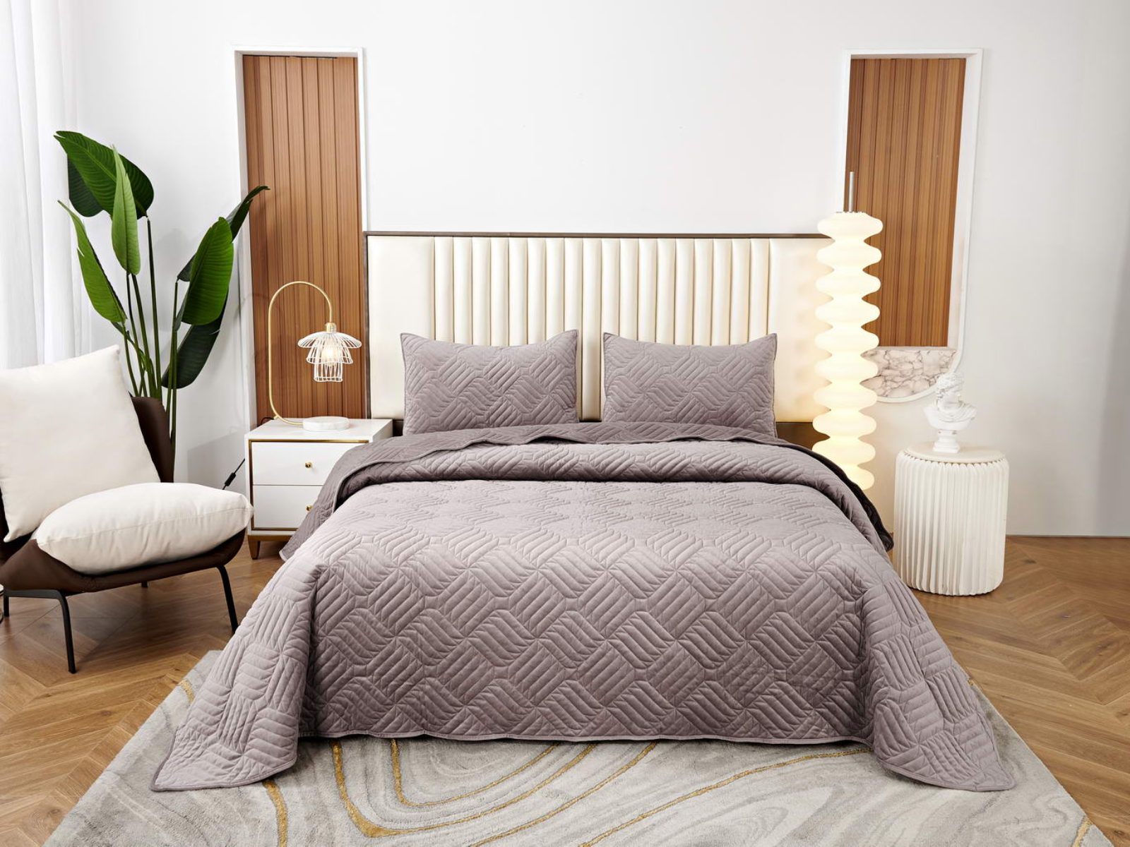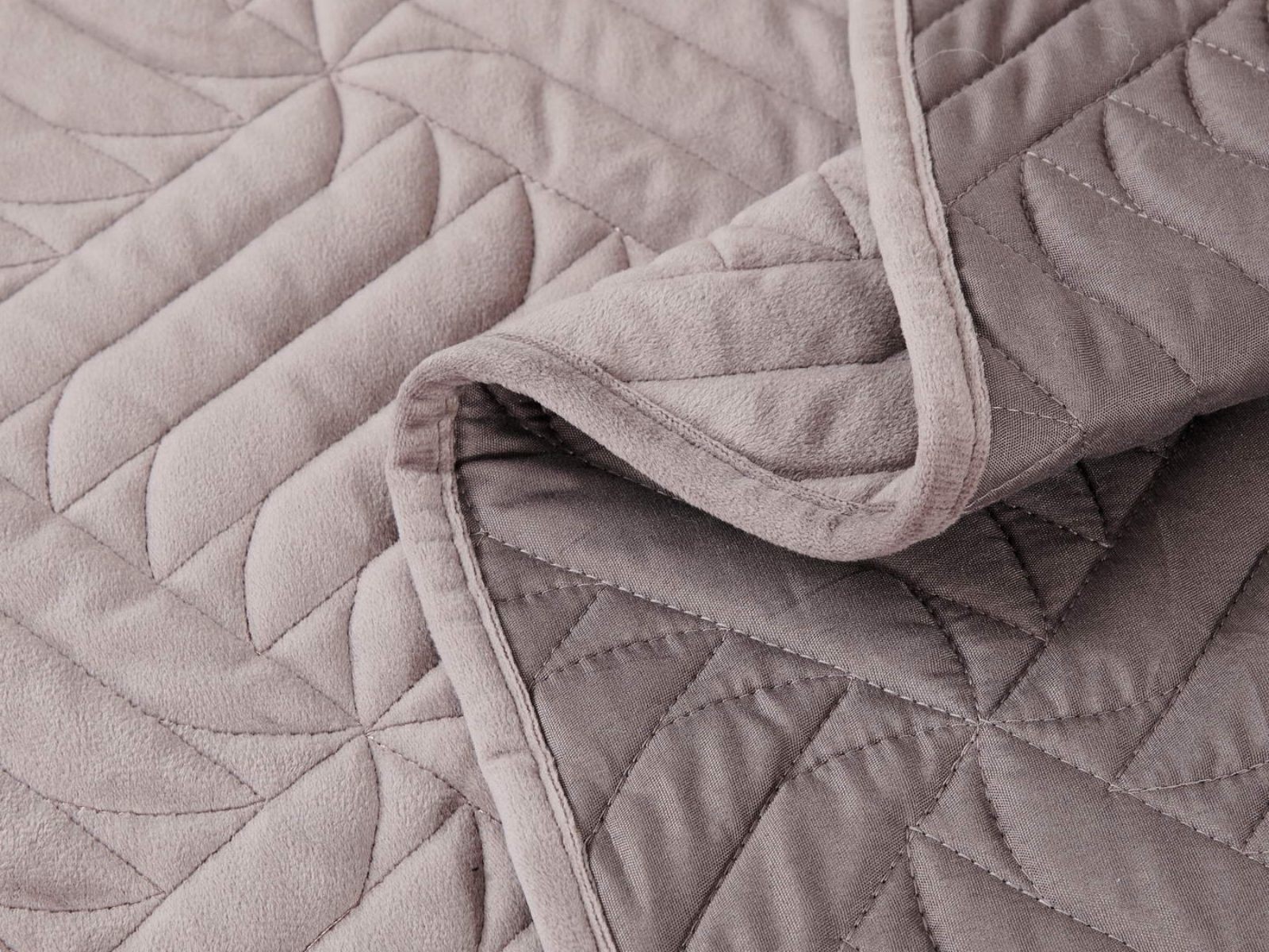 Покрывала выполнены в 10 оттенках: крем, мокко, пепельный, песочный, светло-бежевый, светло-серый, серый, темно-серый, чайная роза и черный. Стежка в виде геометрического орнамента подойдет к любому современному интерьеру. Из-за особого плетения, велюровая ткань покрывала отражает свет и красиво переливается при различном освещении.