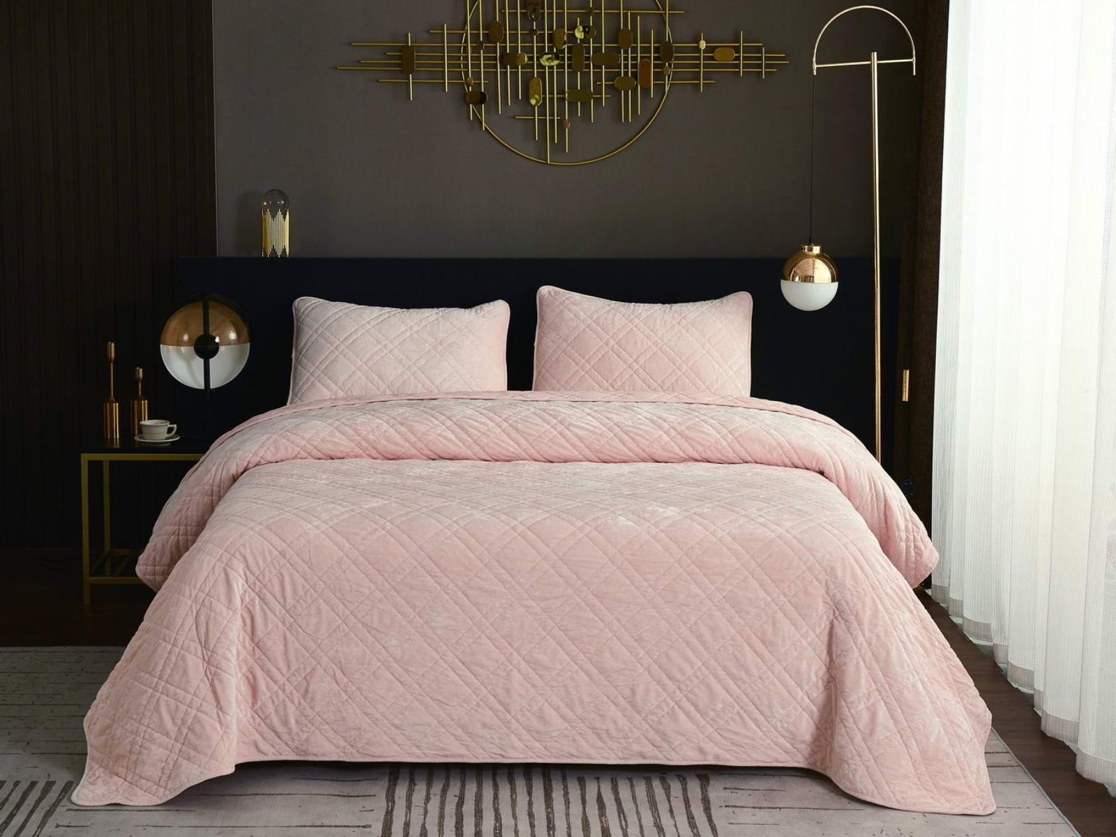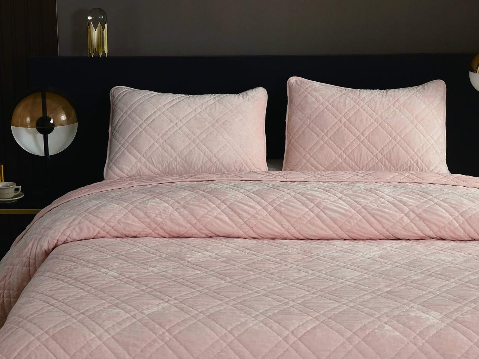 Покрывало Селена выполнено в девяти оттенках: пудра, антрацит, беж, изумруд, капучино, пепел роза, серебро, стоун, терракот. Они подойдут практически для любого интерьера, от классического, до модерна или романтического. Стеганое бархатное покрывало будет необыкновенно смотреться на вашей постели. В комплект входят покрывало и одна либо две наволочки (50х70 см) из аналогичного материала в зависимости от размера.